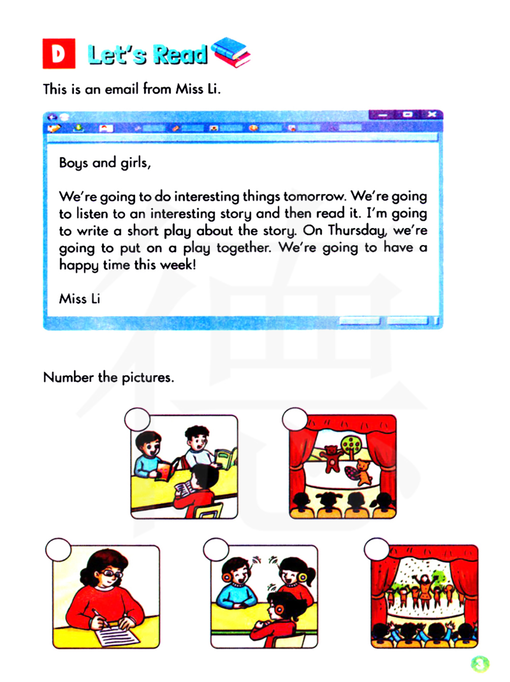 孩子们,我们明天将要做有趣的事情。我们将要听一个有趣的故事然后阅读它。我将要写一出关于这个故事的短剧。星期四,我们将要一起上演一出戏剧。我们这个星期将会度过一段快乐的时光! 李老师