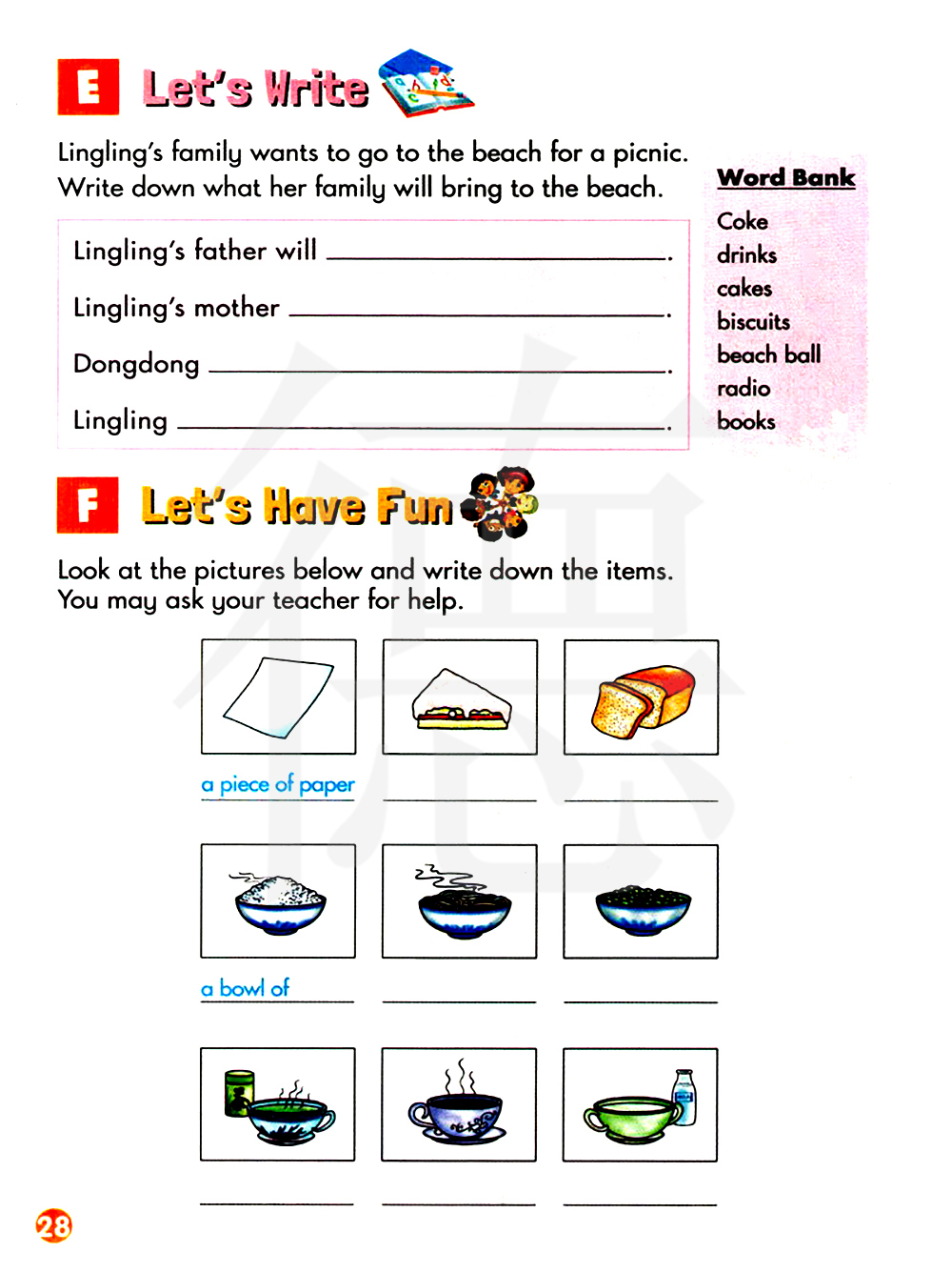 看下面的图片并写下名目。你可以向老师寻求帮助。