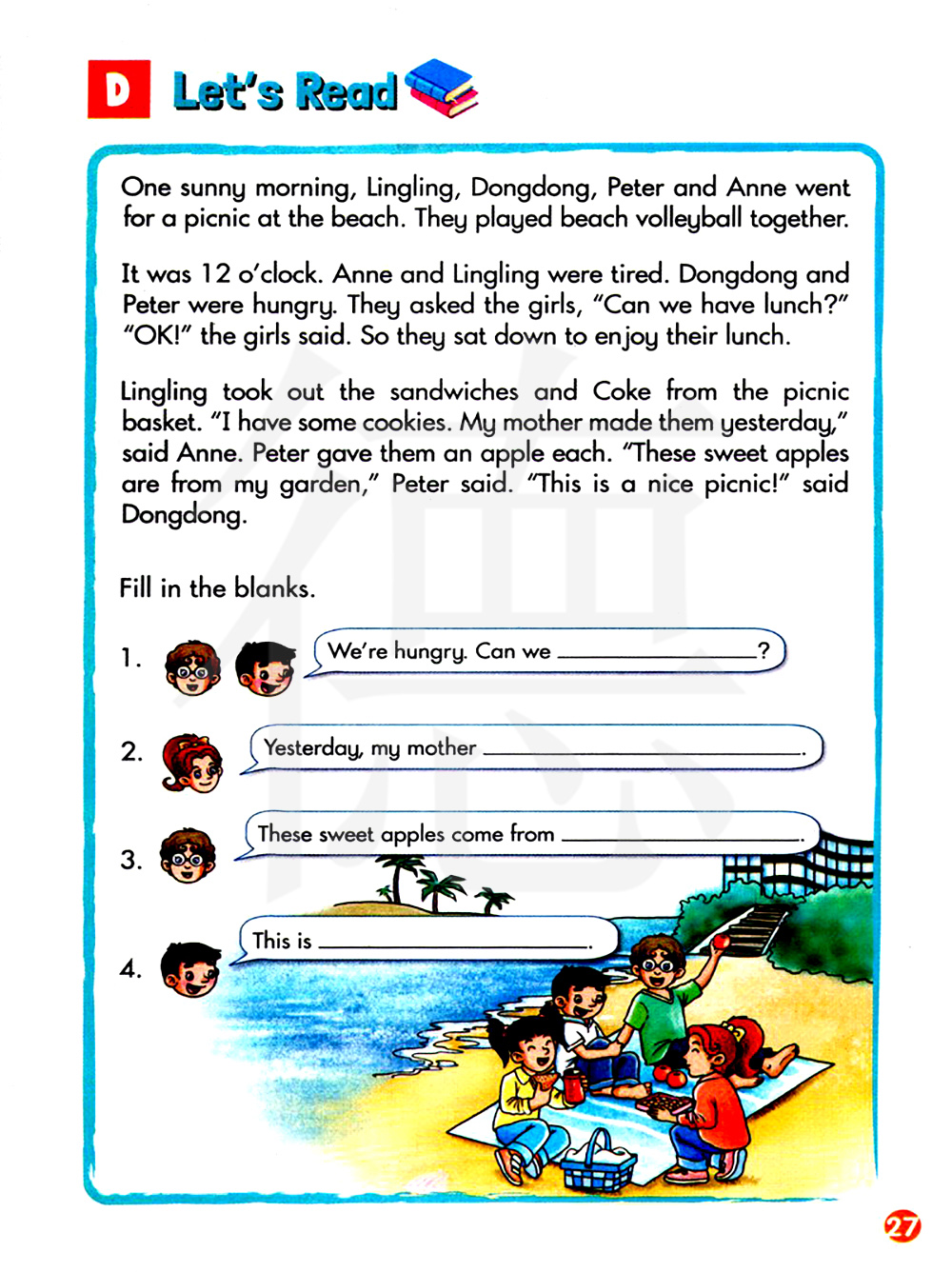玲玲从野餐篮中拿出三明治和可乐。“我有一些曲奇饼。我妈妈昨天做的。”安妮说。彼得给了他们每人一个苹果。“这些甜苹果来自我的花园。”彼得说。“这真是一个很棒的野餐!”东东说。
