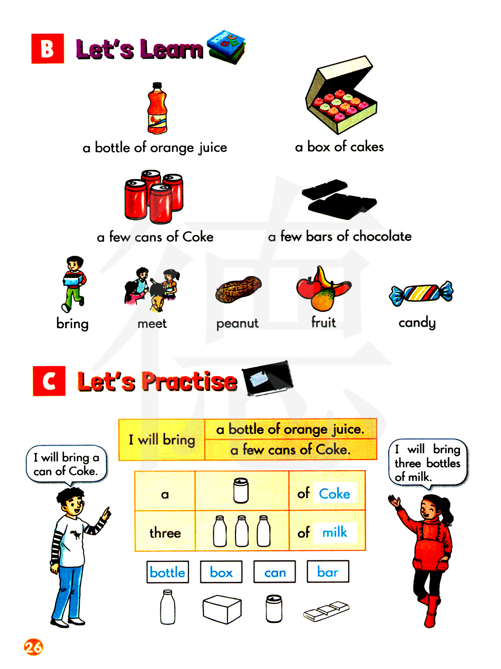 我将带一瓶橙汁。我将带几罐可乐。