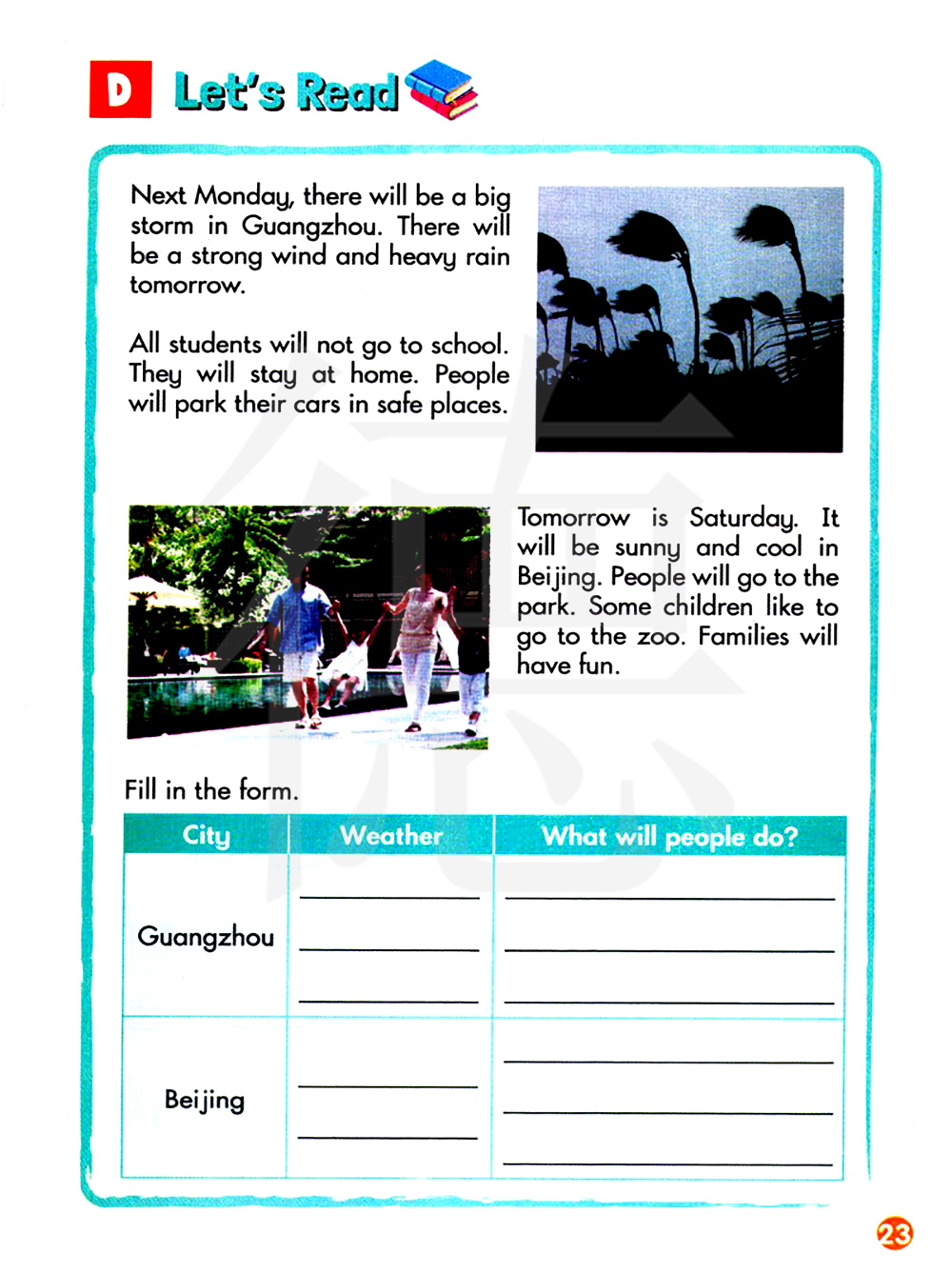 明天是星期六。北京将是晴天,而且很凉爽。人们可以去公园。一些孩子们喜欢去动物园。一家人将会玩得很开心。