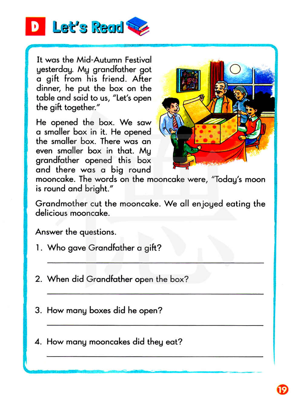 他打开了盒子。我们看见里面有个小盒子。他打开小盒子。里面有一个更小的盒子。爷爷打开这个盒子,里面有一个又大又圆的月饼。月饼上的字写着:“今夜的月亮圆又亮。”