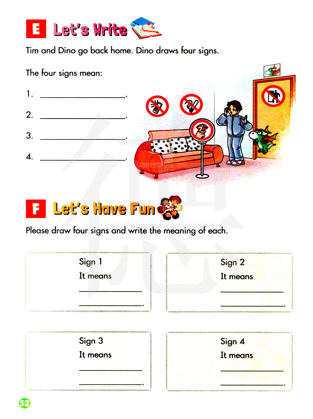 一起来写一写。蒂姆和迪诺回到家。迪诺画了四个标志。