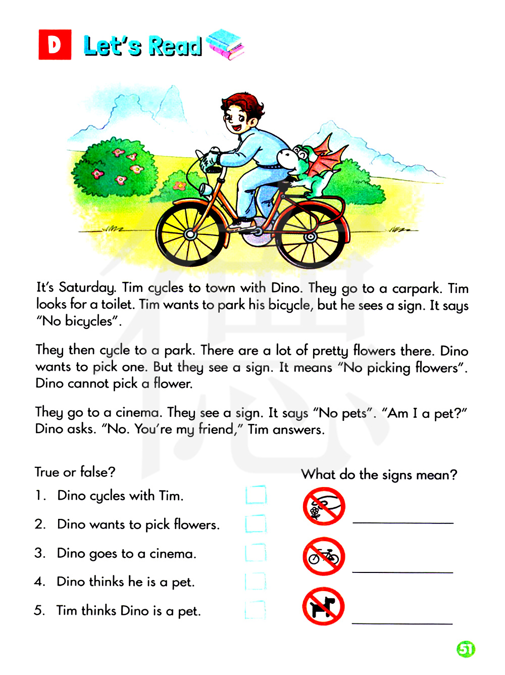 然后他们骑自行车去公园。那里有很多漂亮的花。迪诺想摘花。但是他们看到一个标志。它的意思是“请不要摘花”。迪诺不能摘花