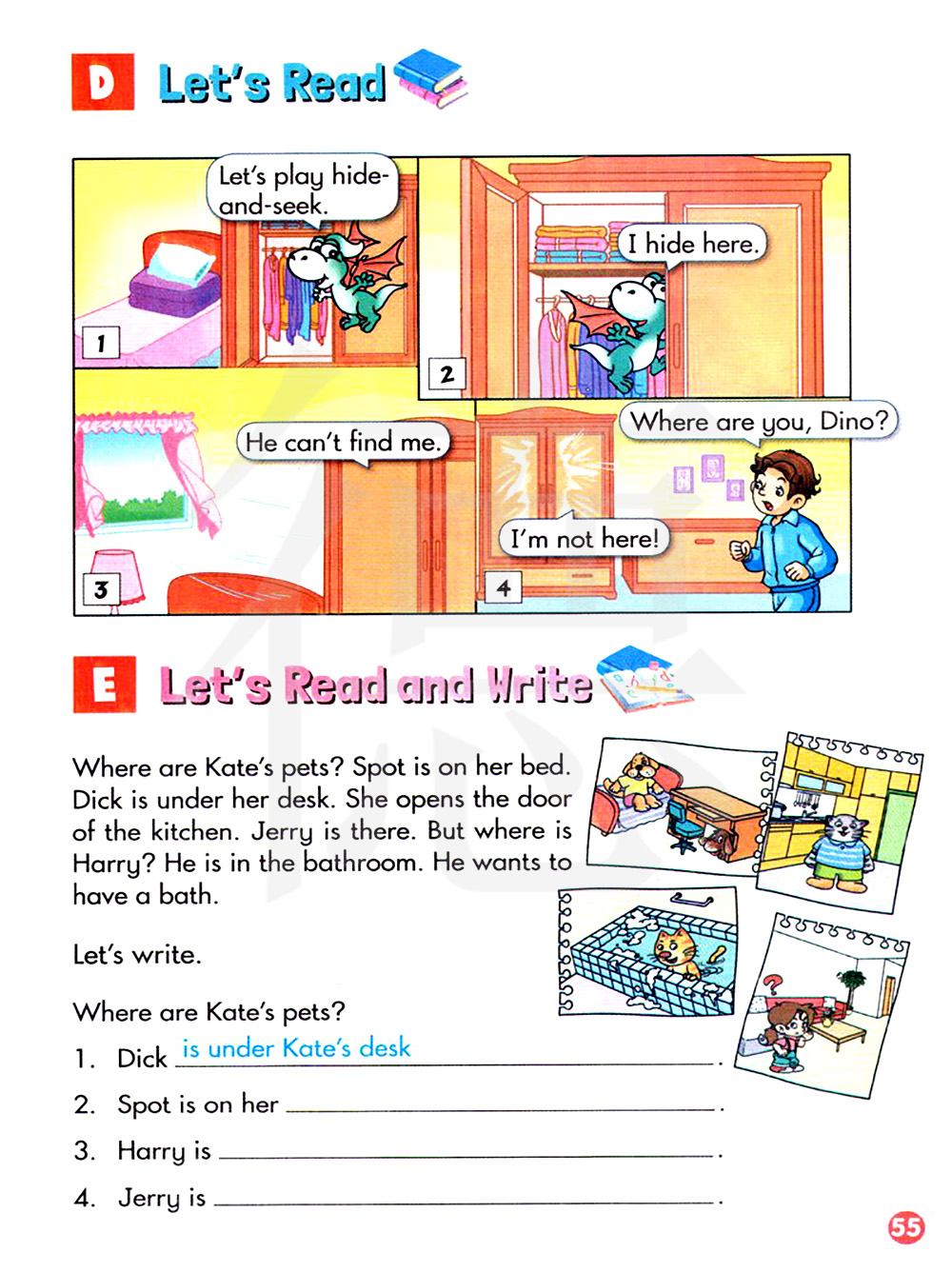 凯特的宠物在哪里?斯伯特在她的床上,迪克在她的书桌下。她打开厨房的门,杰瑞在哪里,但是哈利在哪里,他在浴室,他想洗澡。