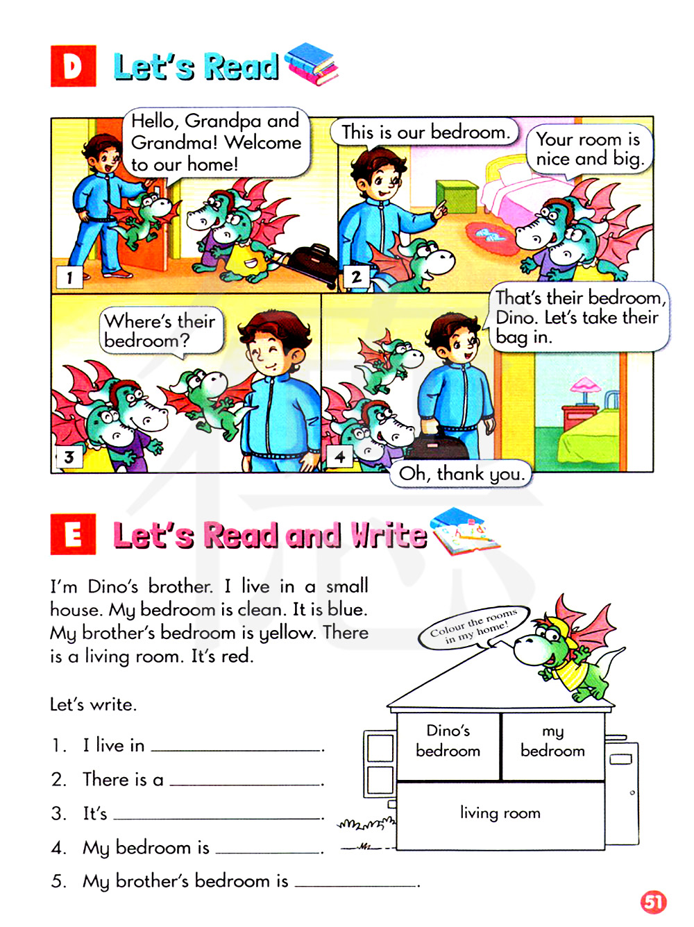 我是迪诺的弟弟,我住在一所小房子里,我的卧室很干净,它是蓝色的,我的哥哥的卧室是黄色的,有一间客厅,它是红色的。