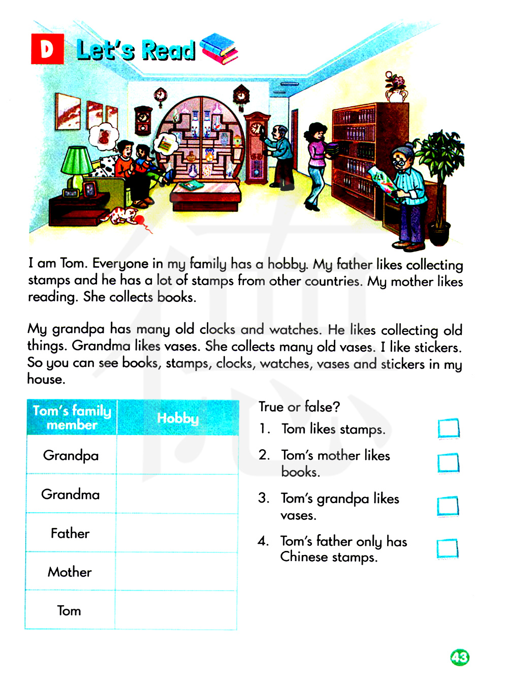 我是汤姆。我家里的每个人都有一个爱好。我爸爸喜欢收集邮票,他有许多来自其它国家的邮票。我妈妈喜欢阅读。她收集书。