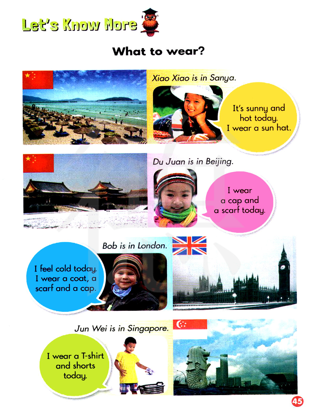 今天我觉得很冷,我穿着一件外套,围着一条围巾,戴着一顶帽子。