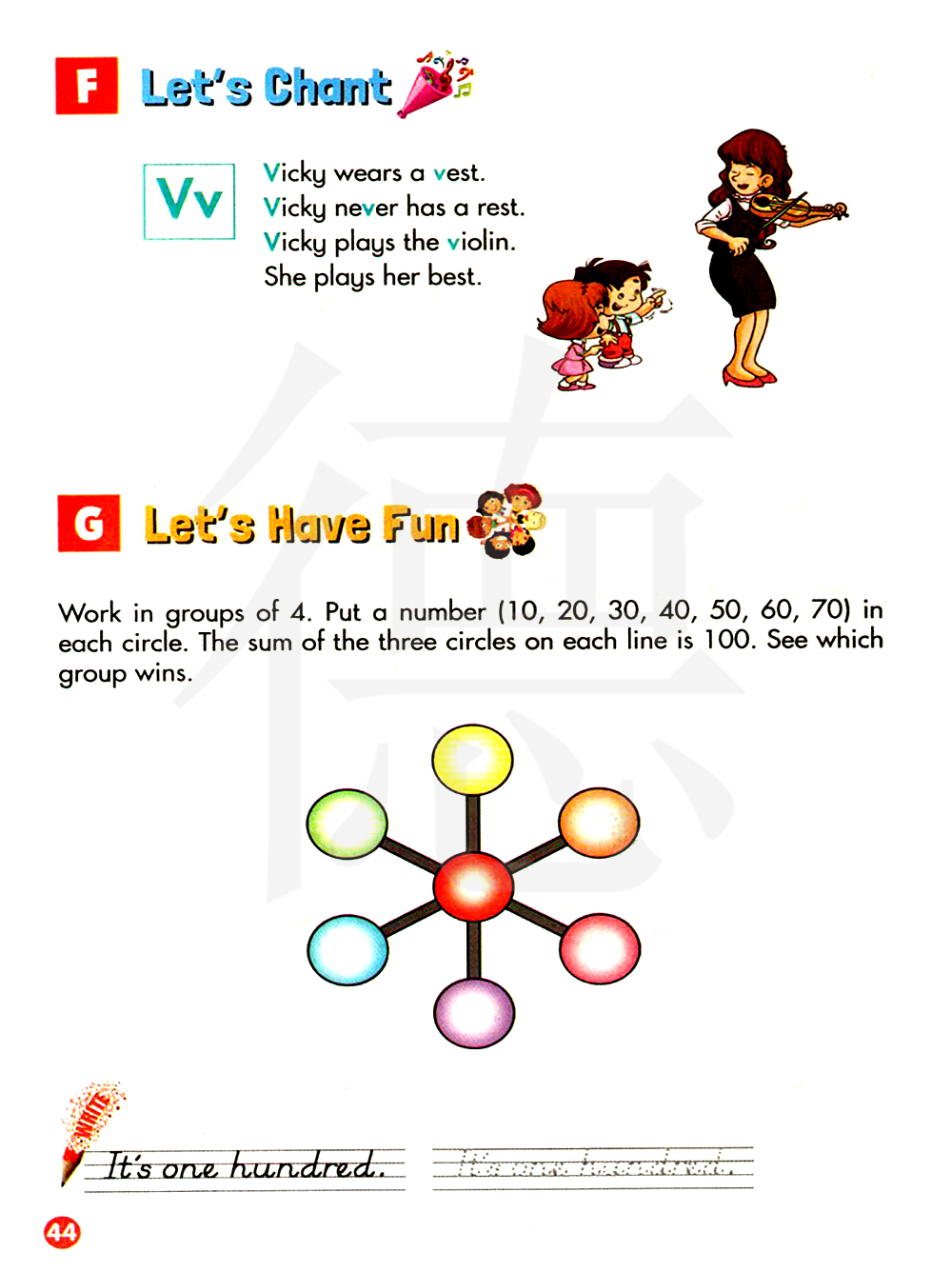 分四个小组练习。把(10.20.30.40.50.60.70)分别写在每个圈中。线上每三个相邻圆圈中的总数是一百。看看哪组能赢。