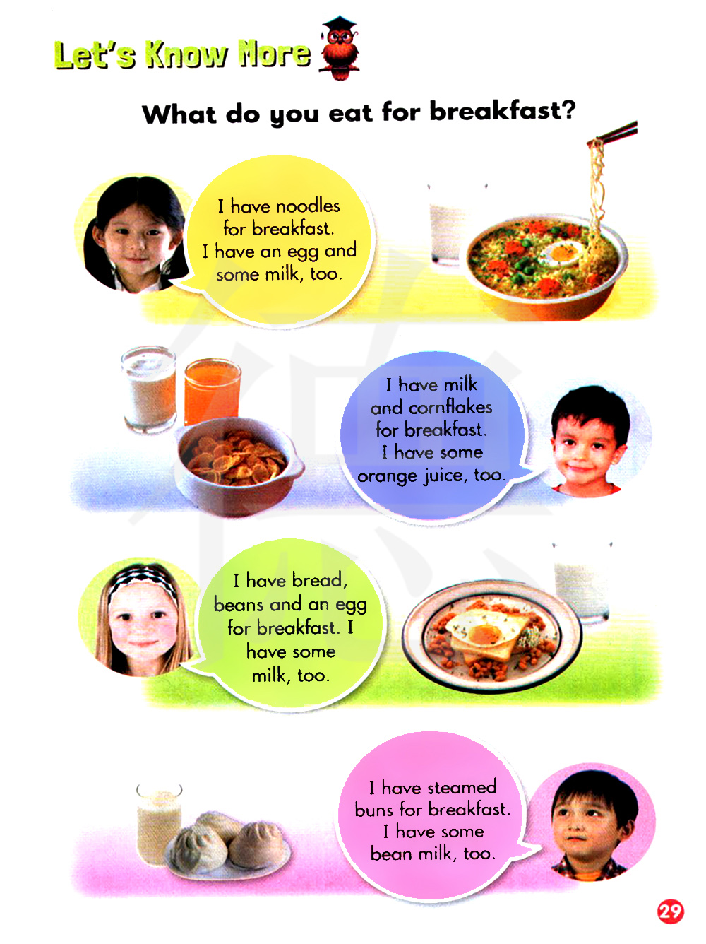 我早餐吃面条,我也吃一个鸡蛋和喝一些牛奶。