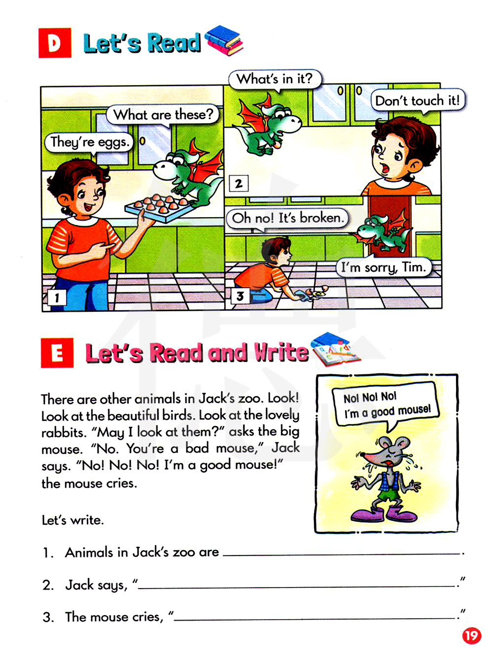 杰克的动物园里有一些其他的动物。看!看这些漂亮的鸟,看这些可爱的兔子。“我可以看它们吗”这只大大的老鼠问道,“不行”你是一只坏老鼠。“杰克回答道”“不!不!不!”我是一只好老鼠!这只老鼠哭喊道。