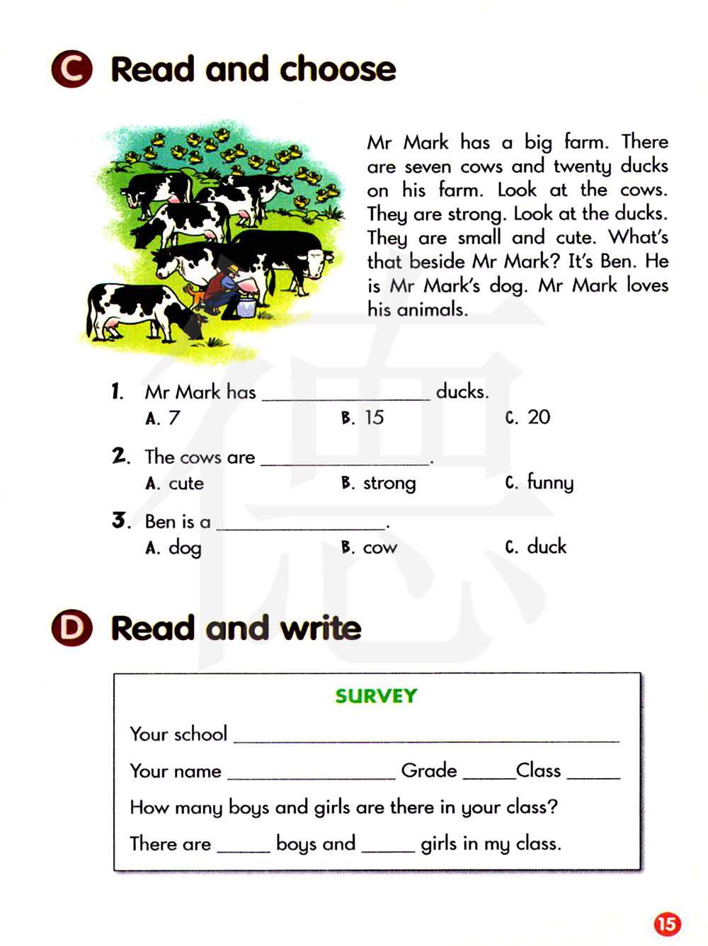 马克先生有个大大的农场,他的农场里有七头奶牛和二十只鸭子。看这些奶牛,它们很强壮,看这些鸭子,它们又小又可爱,马克先生的旁边是什么,是本,他是马克先生的狗,马克先生很喜爱他的动物。