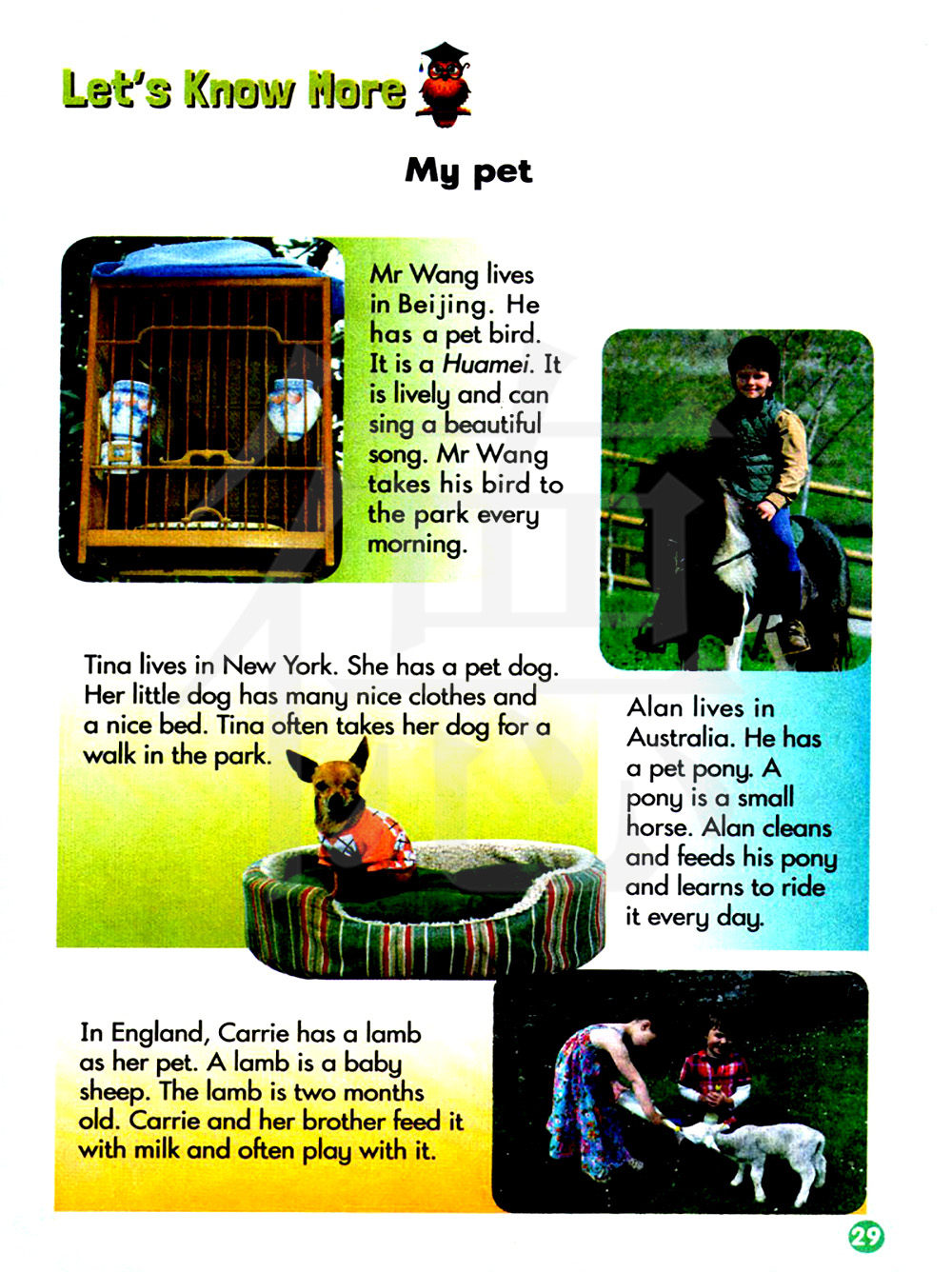 在英格兰,卡丽把一只小羊羔作为她的宠物。小羊羔是一只羊宝宝。小羊羔两个月大啦。卡丽和她的弟弟喂它牛奶,并且经常和它玩耍