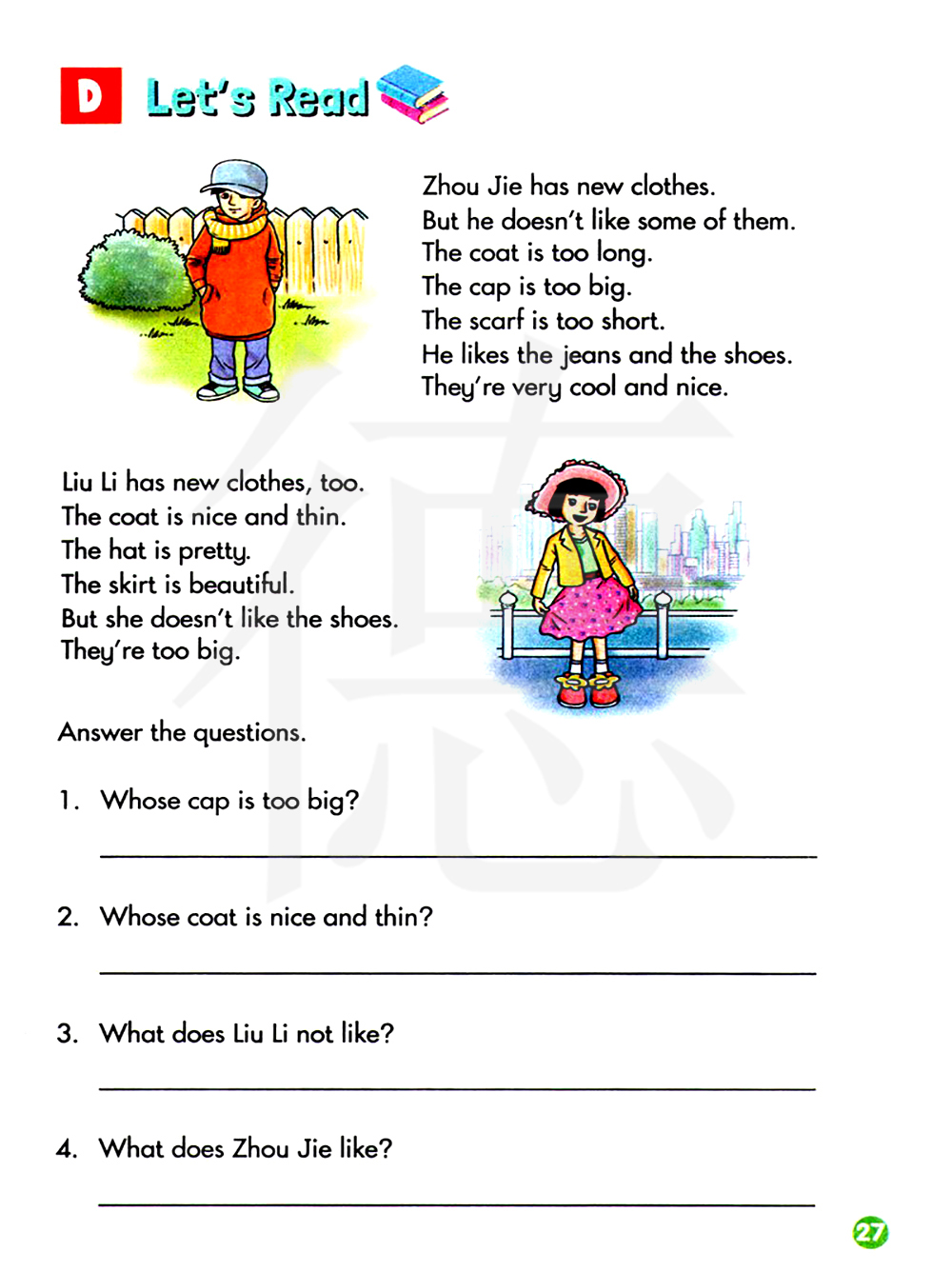 周杰有新衣服。但是他不喜欢其中一些。这件外套太长。这顶帽子太大。这条围巾太短。他喜欢这条牛仔裤和这双鞋子。它们非常酷和漂亮。