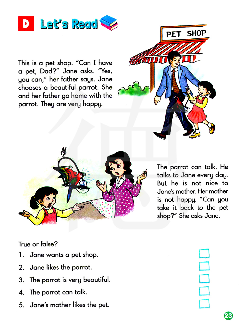 对还是错? 1.简想要一个宠物店。 2.简喜欢鹦鹉。 3.这只鹦鹉是非常漂亮的。 4.这只鹦鹉会说话。 5.简的妈妈喜欢那个宠物。