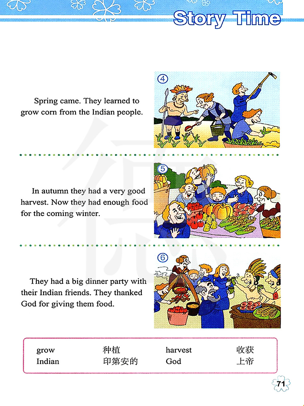 他们和他们的印第安人朋友进行了盛大的晚餐聚会。他们感谢上帝赐予他们食物。