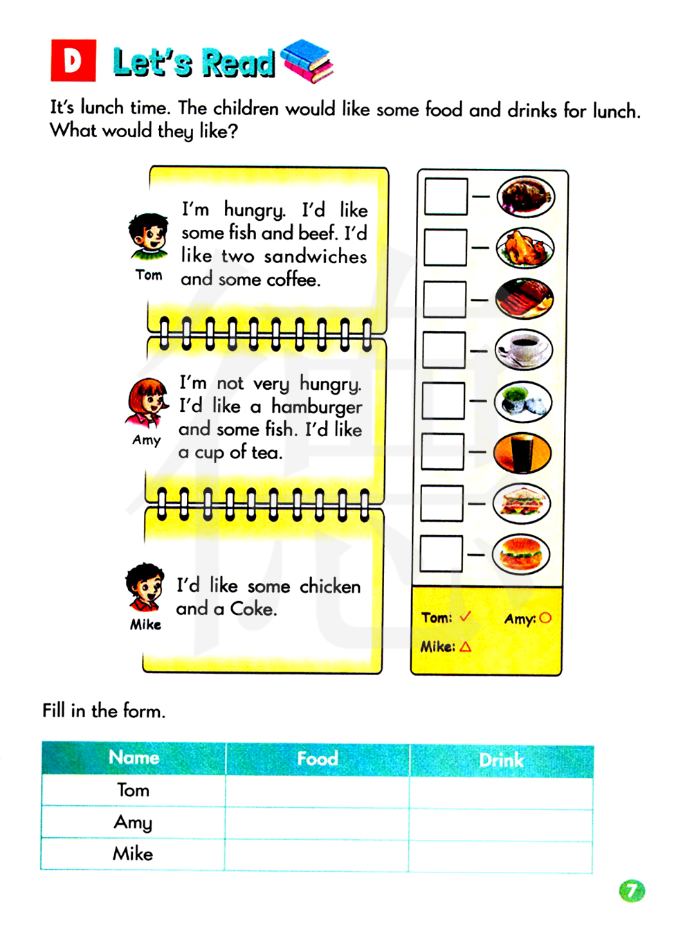 现在是午餐时间。孩子们想要些食物和饮料作为午餐。他们想要什么呢?