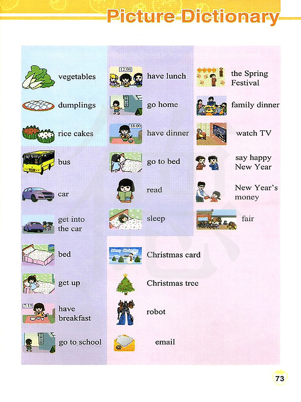 蔬菜 饺子 年糕 公共汽车 小轿车 上车 床 起床 吃早饭 去学校