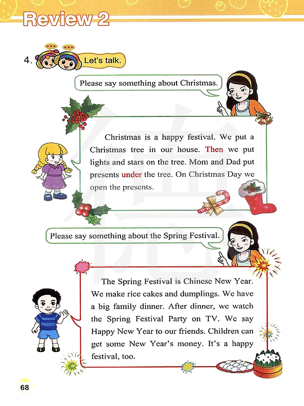 春节是中国的新年。我们做年糕和包饺子。我们有一个盛大的家庭晚餐。晚餐过后,我们会在电视上看春联联欢晚会。我们会对我们的朋友说新年快乐。孩子们能得到一些压岁钱。这也是一个快乐的节日。