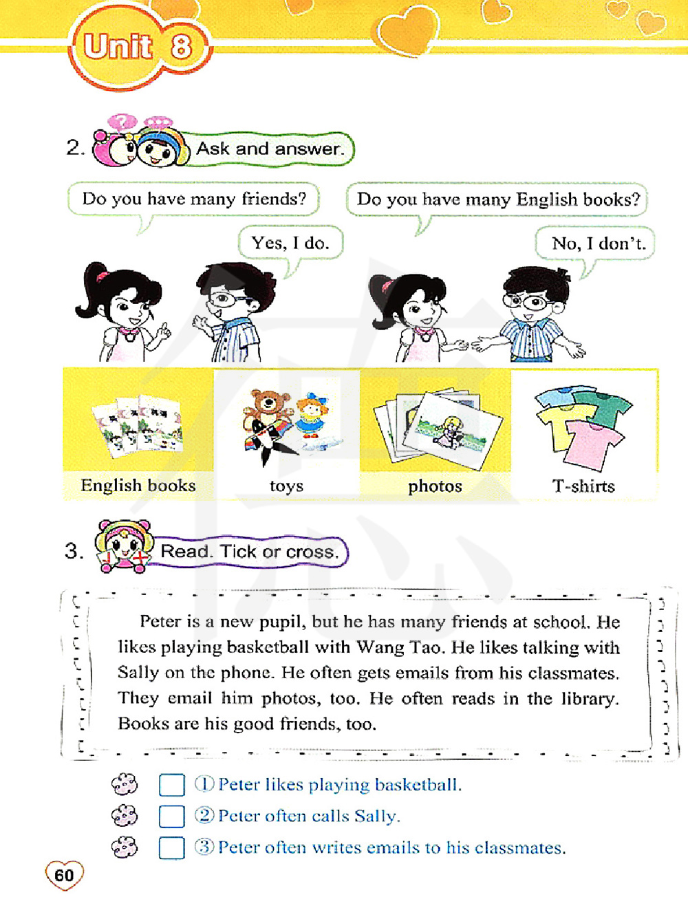 彼得是新生,但是他在学校有很多朋友。他喜欢跟王涛一起打篮球。他喜欢用电话跟萨莉聊天。他经常收到来自同学的邮件。他们还给他发照片。他经常在图书馆看书。书也是他的好朋友。