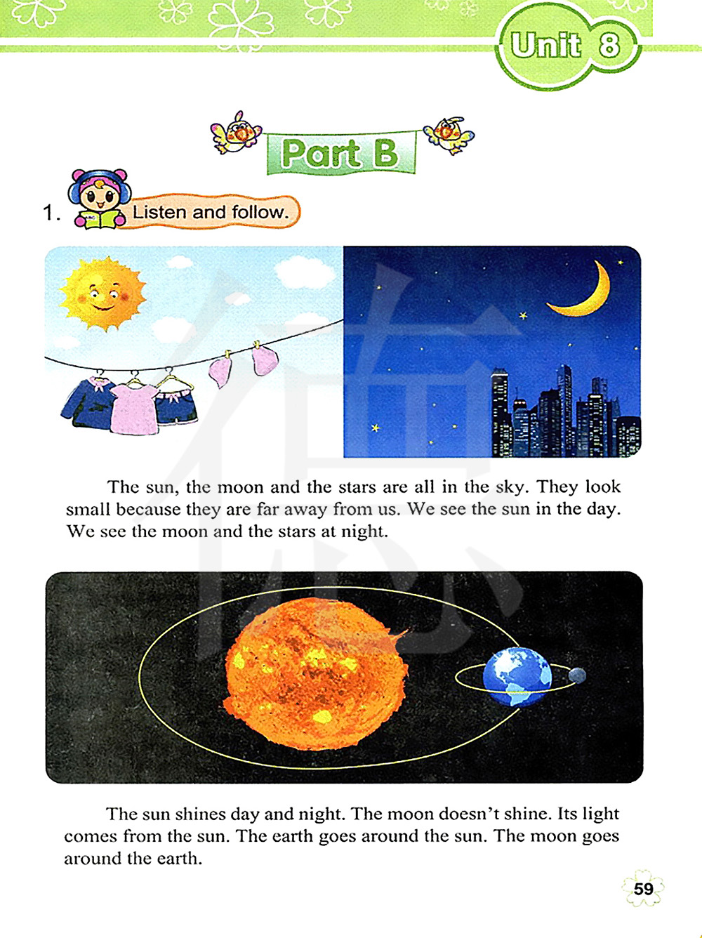 太阳、月亮和星星都在天空上。它们看上去小是因为它们离我们很遥远。 白天,我们能看到太阳。夜晚,我们能看到月亮和星星。
