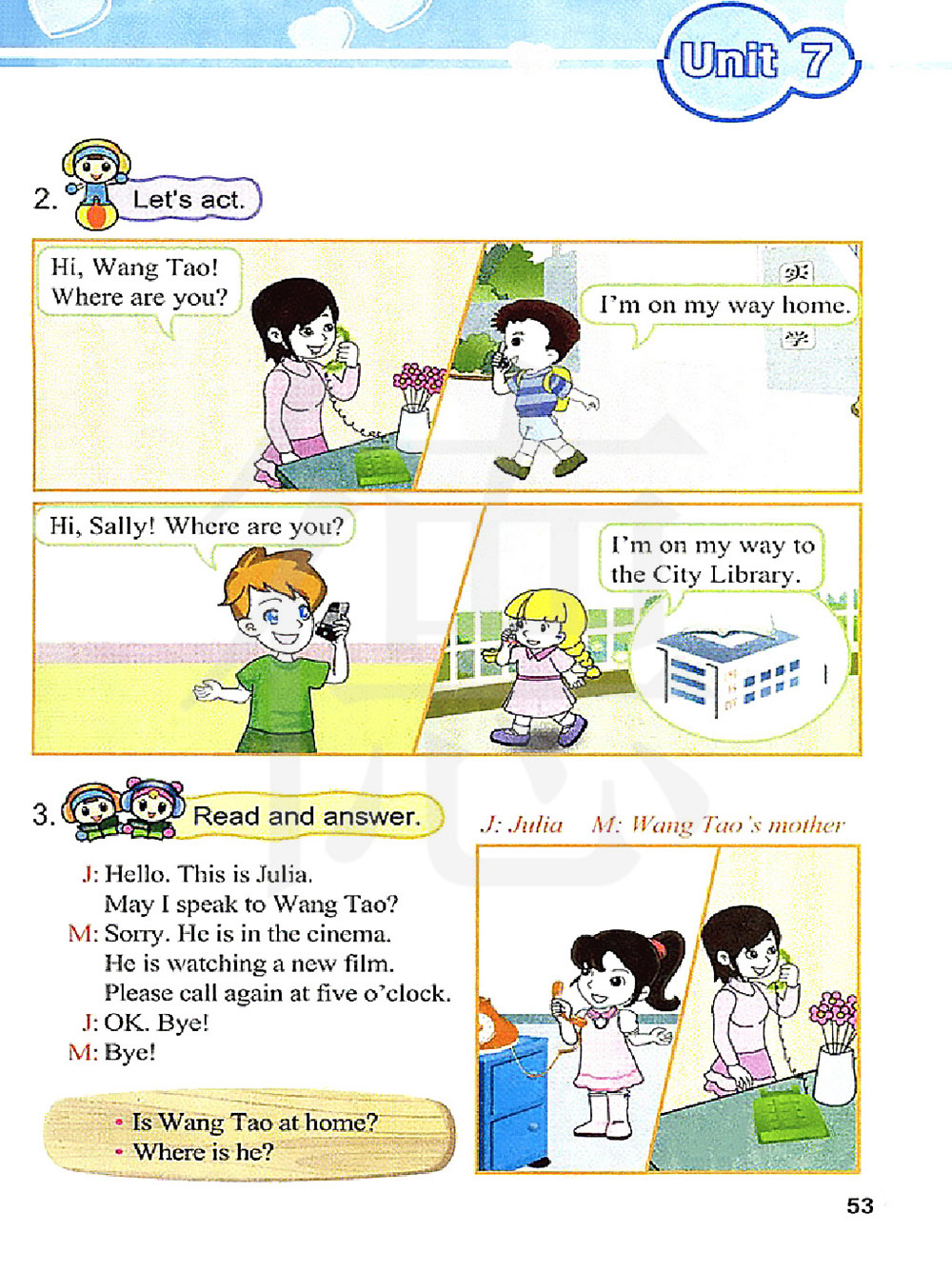 你好,我是茱莉亚,我能跟王涛说话吗? 抱歉,他在电影院, 他正在看一个新电影,请在五点再打过来吧。 好的,再见!再见!