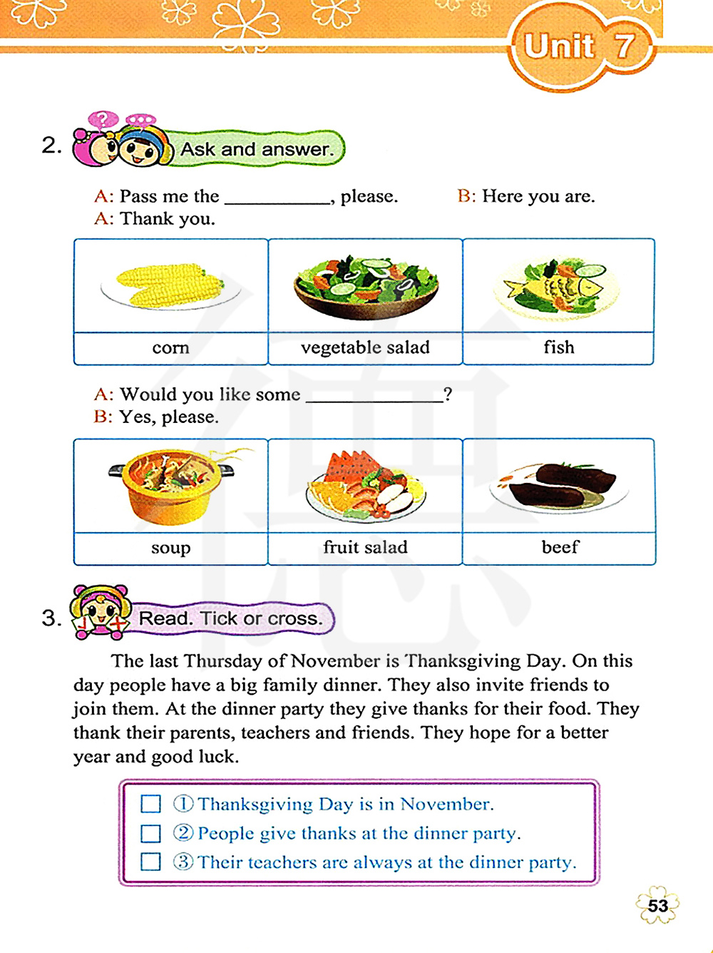 十一月的最后一个星期四是感恩节。 在这一天,人们会有一个大型的家庭聚餐。 他们也会邀请朋友们来一起参加。在晚餐聚会上,他们会感恩食物。 他们会感恩他们的父母、老师和朋友们。 他们希望有更好的一年和好运气。