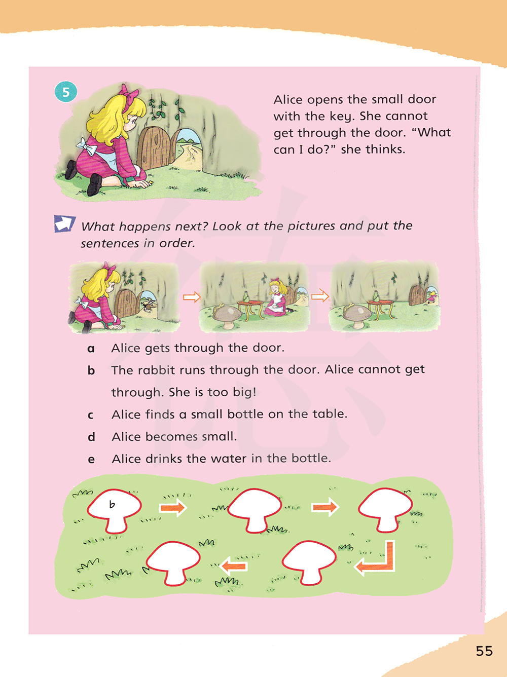 b 那只兔子跑着穿过了门,艾丽丝不能穿过,她太大了!