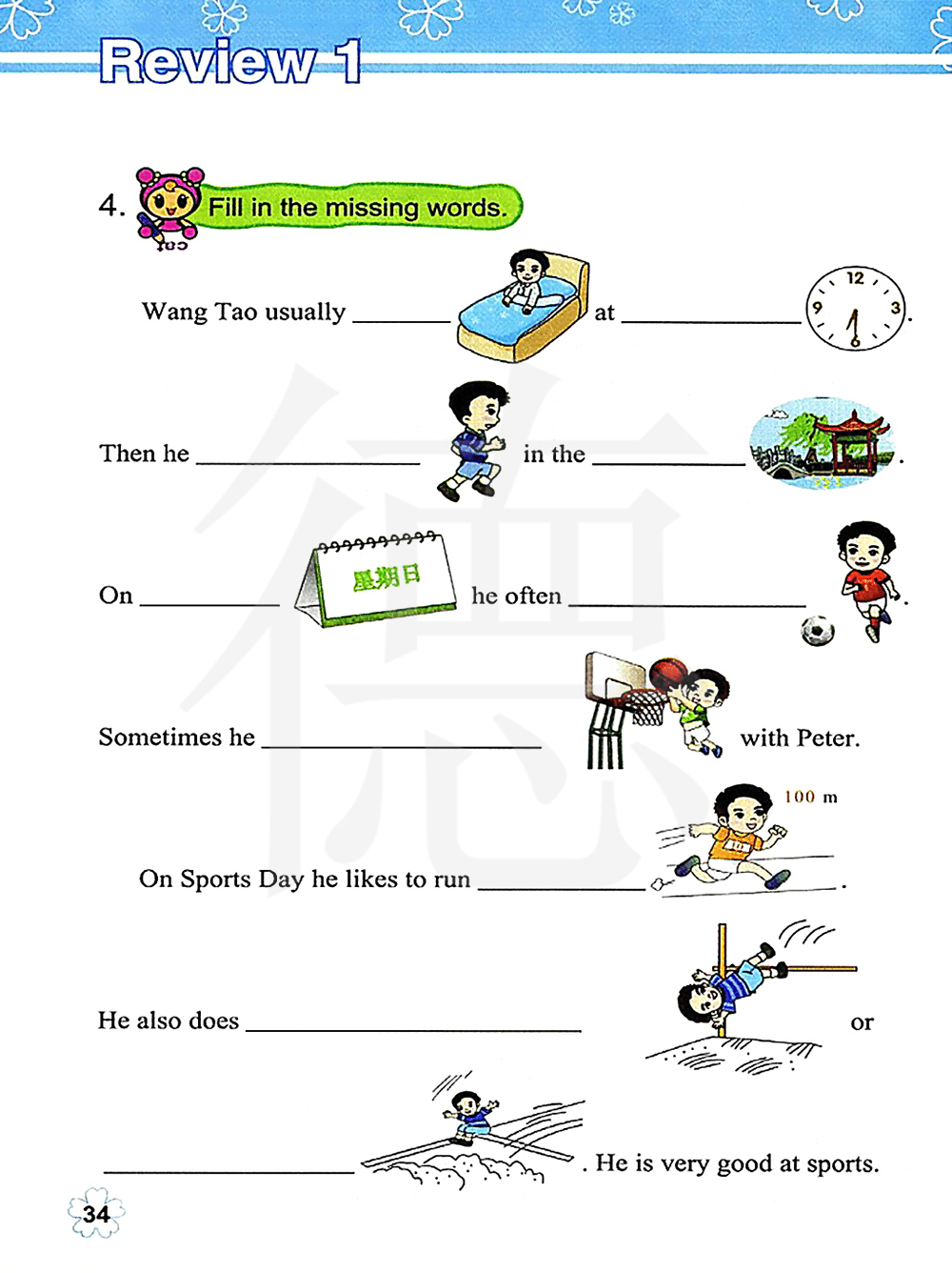 王涛通常在六点半起床,然后他就去公园跑步,星期天他经常踢足球,有时候他也和彼得打篮球。
