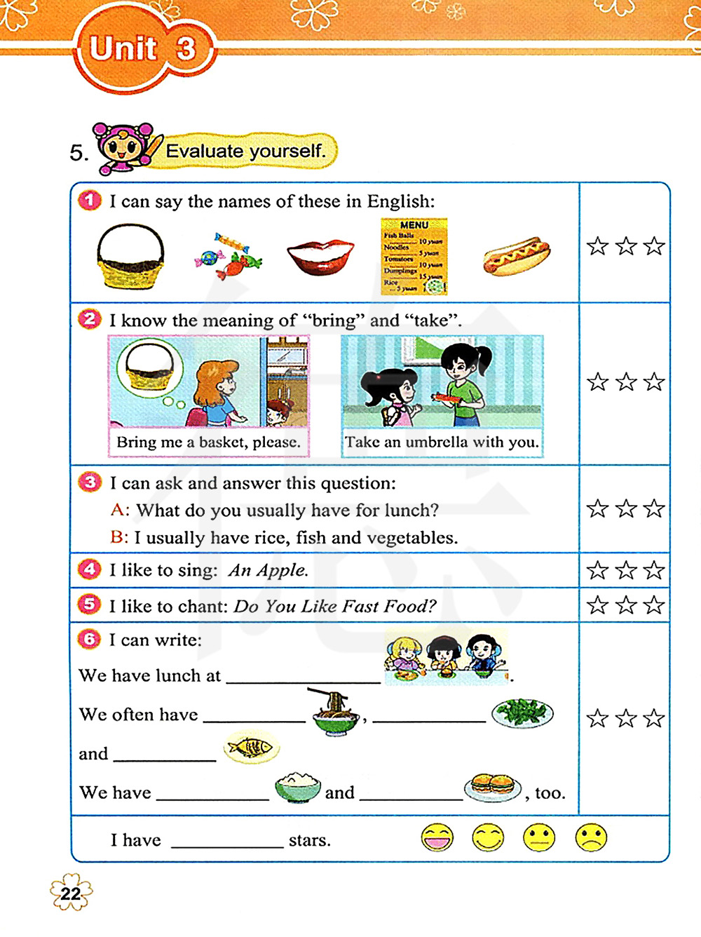 你午餐通常吃什么?我通常吃米饭、鱼和蔬菜。