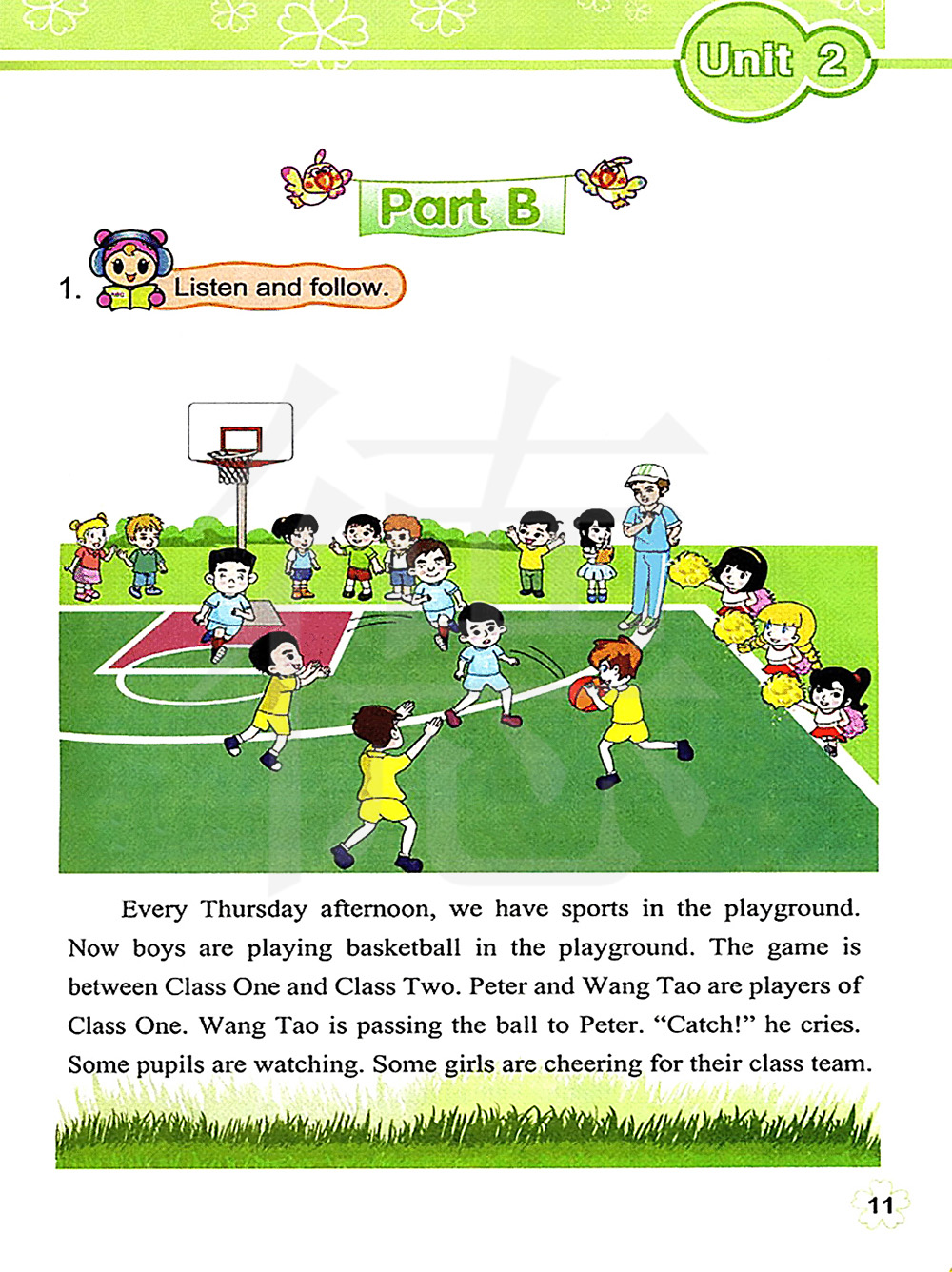每个周四的下午,我们都在操场上做运动。现在,男孩儿在操场上打篮球。比赛在一班和二班之间进行。彼得和王涛都是一班的队员。王涛把球传给彼得。接住!他大喊。有些学生在看球。有些女孩儿们在为她们的班队欢呼呐喊。