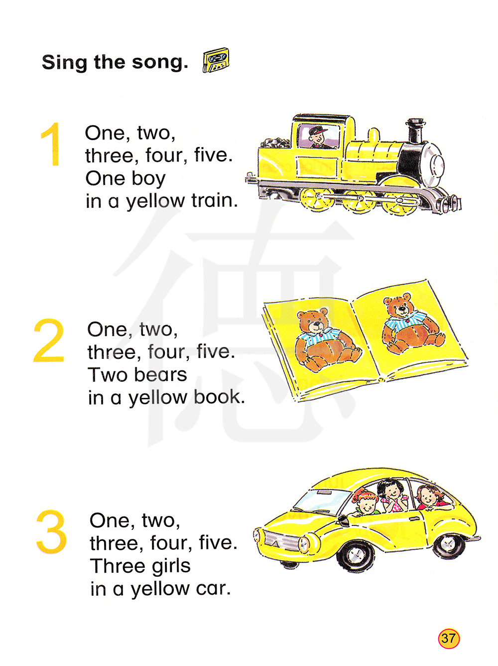 一,二,三,四,五。黄色的小汽车里有三个女孩。