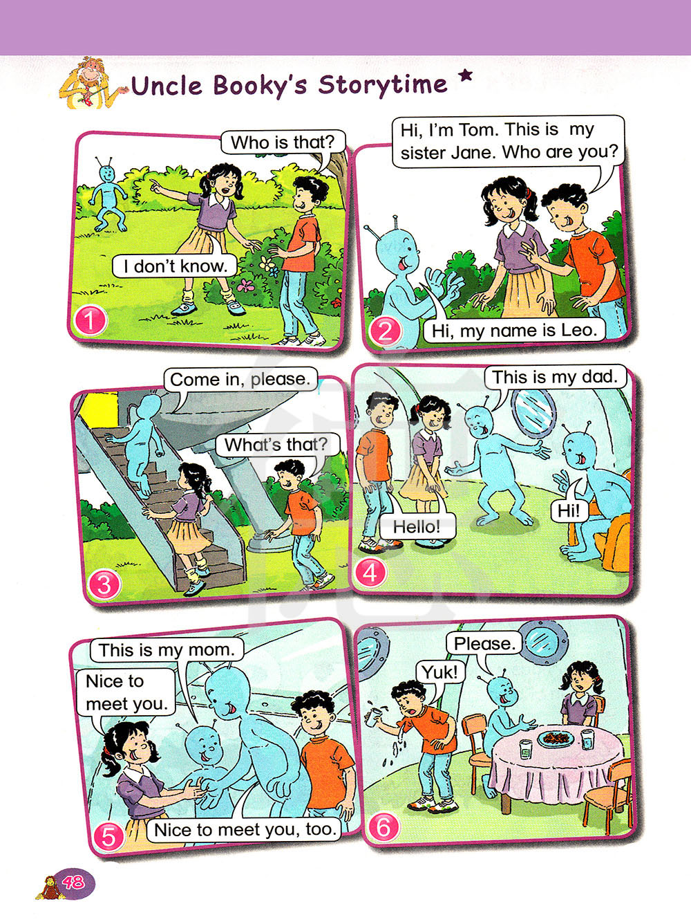你好,我是汤姆。这是我的姐姐简。你是谁?