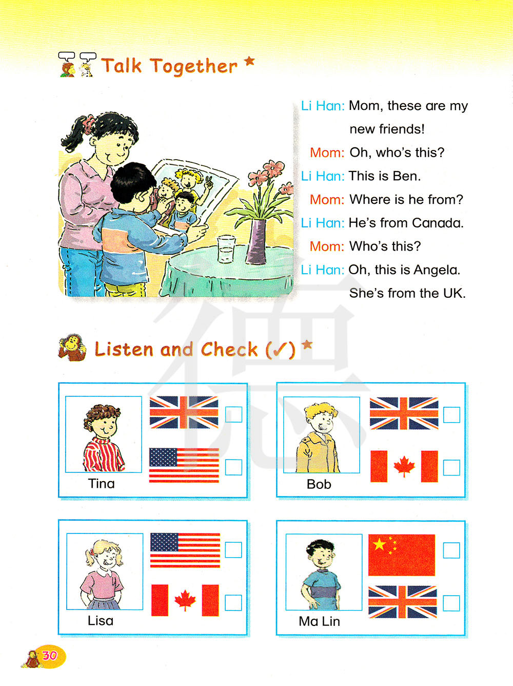 他来自哪里?他来自加拿大。这是谁?啊,这是安吉拉。她来自英国。