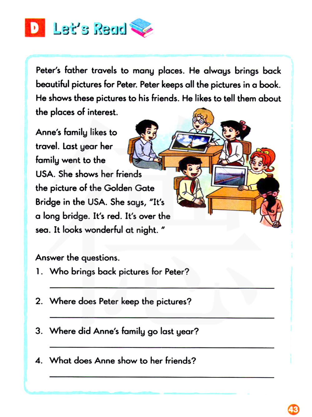 安妮一家人喜欢旅行,上一年,她们一家人去了美国.她给她的朋友看了美国金门大桥的照片,她说那是一座很长的桥,它是红色的,在海上,在夜晚的时候看起来很壮观.