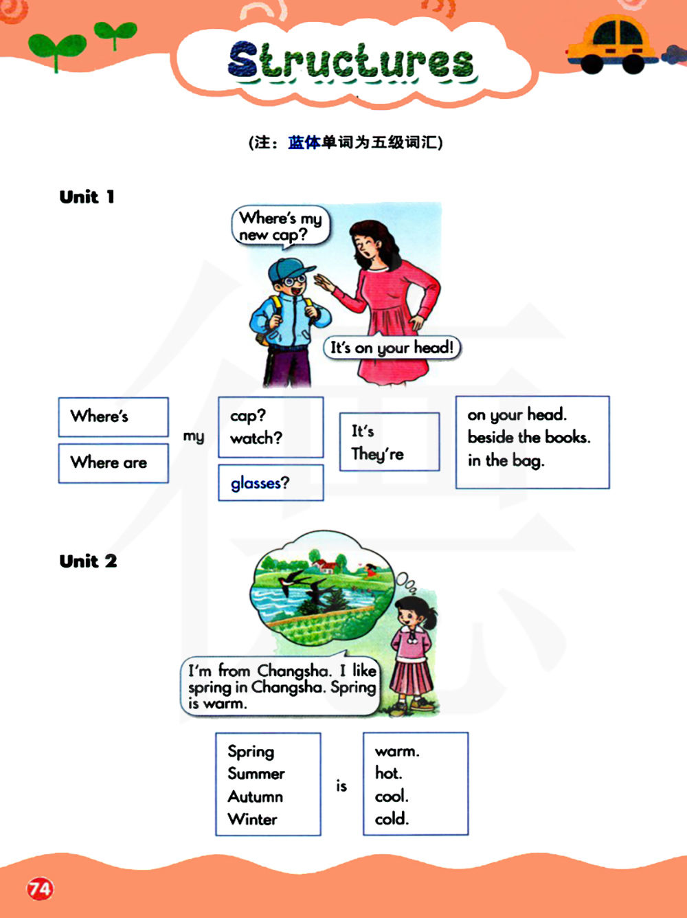 我的帽子在哪里? 我的手表在哪里? 我的眼镜在哪里? 它在你的头上。它在书本旁边 ,它在包里 。它们在你的头上。它们在书本旁边。它们在包里。