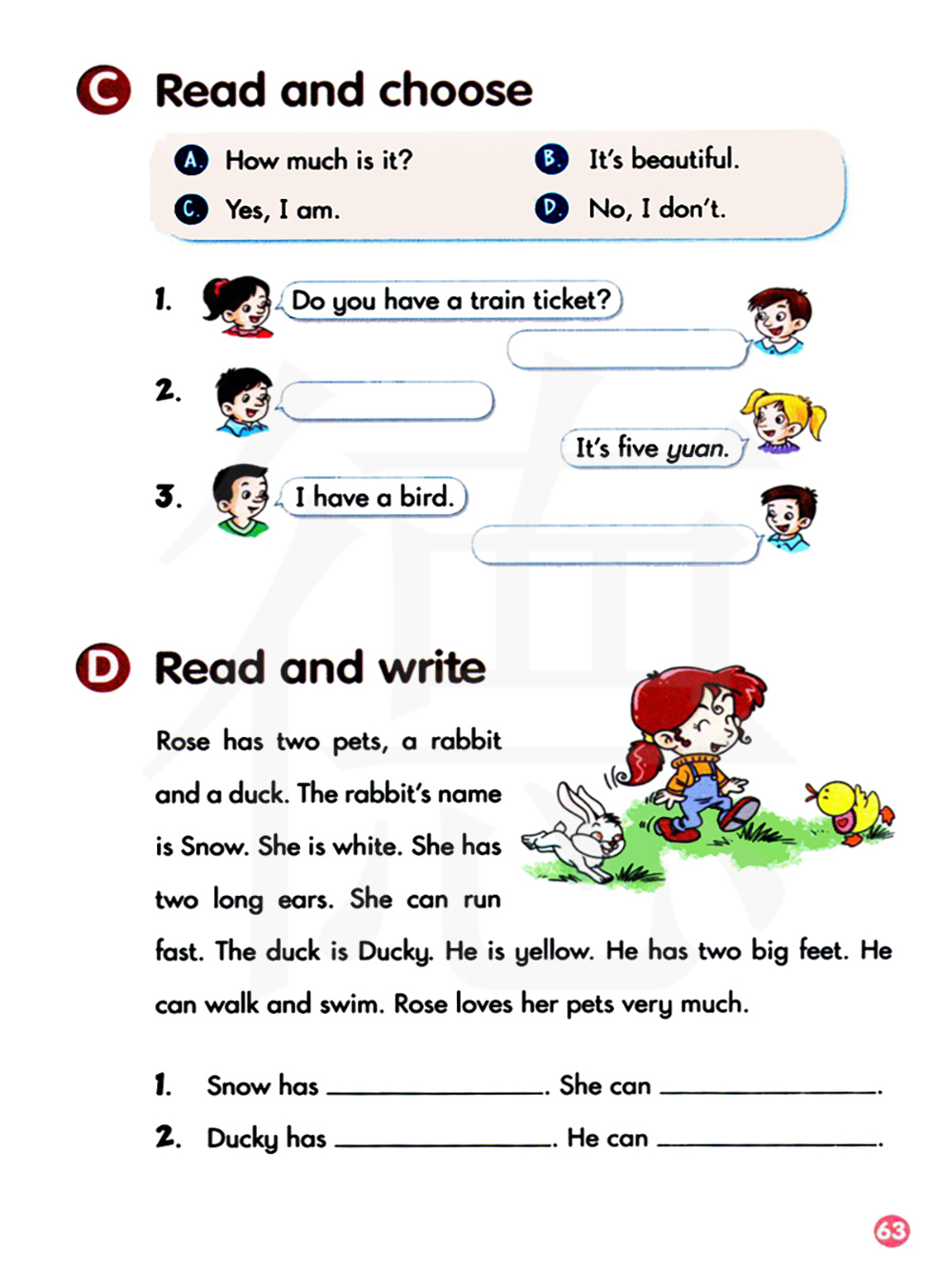 罗斯有两只宠物,一只兔子和一只鸭子。这只兔子叫雪。它是白色的。它有两只长长的耳朵。它能跑的很快。这只鸭子叫达克。它是黄色的。它有两只大大的脚。它会走路和游泳。罗斯非常爱她的两只宠物。