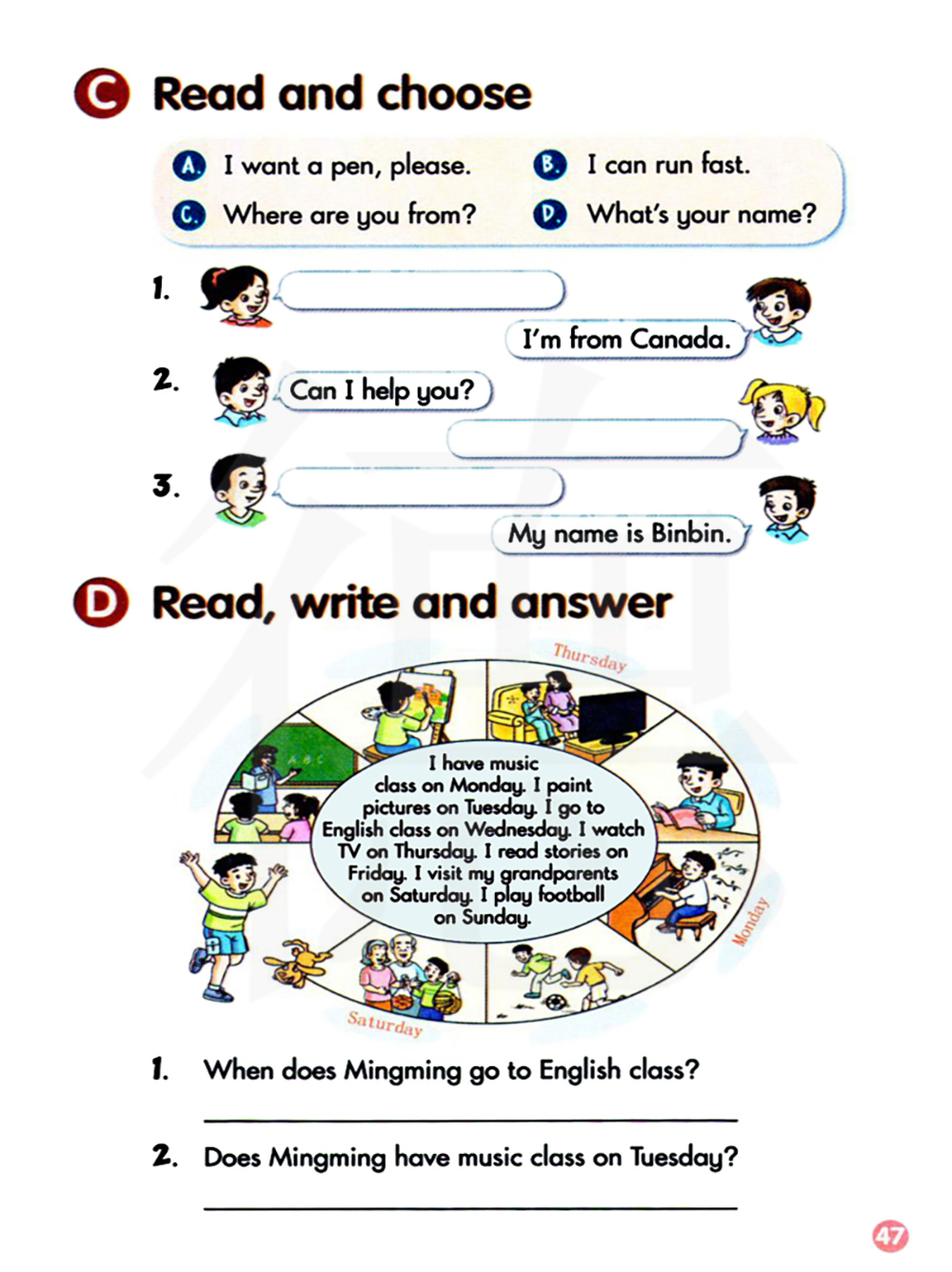 我想要一只钢笔。 我能跑的很快。 你来自哪里? 你叫什么名字?