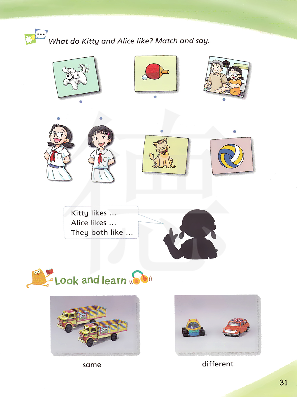 基蒂和艾丽丝喜欢什么?搭配并说一说。