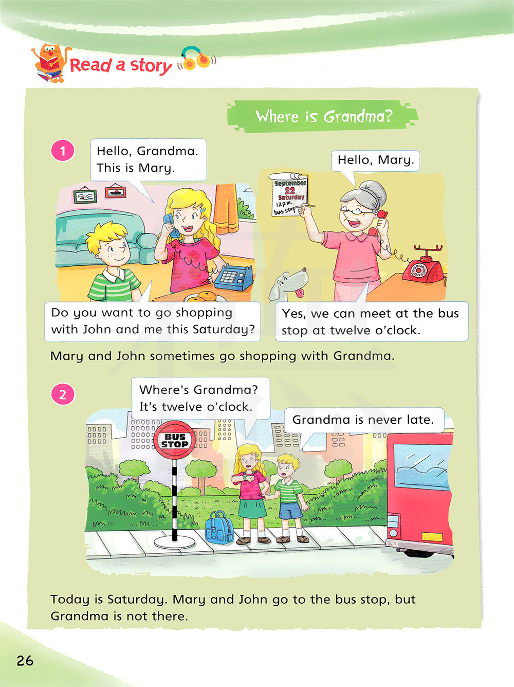 今天是星期六,玛丽和约翰去公交车站,但是奶奶不在那儿。