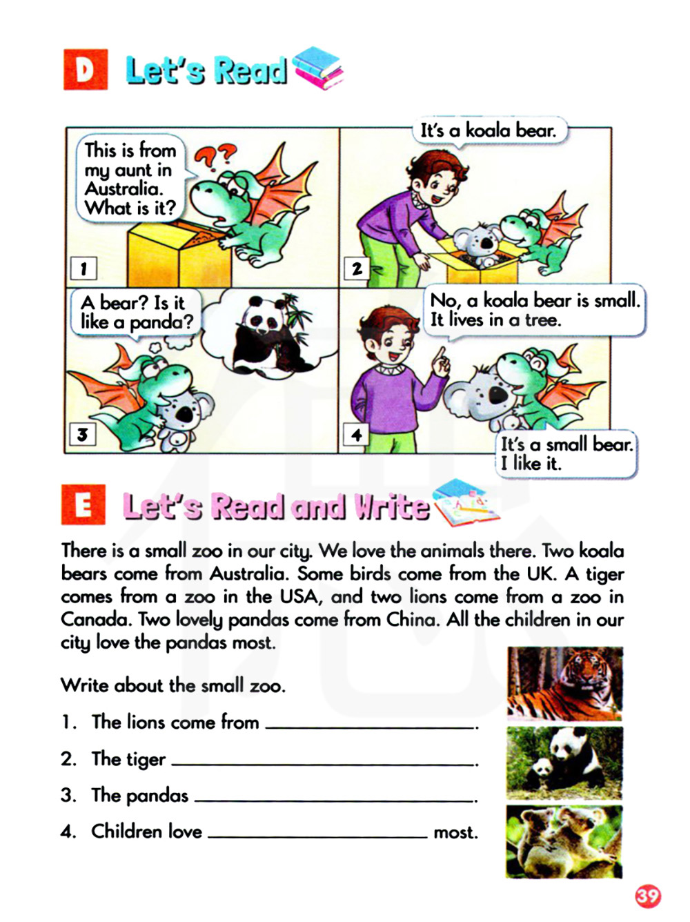 在我们的城市有一个小动物园。我们喜欢那儿的动物。两只树袋熊来自澳大利亚。一些鸟来自英国。一只老虎来自美国的一个动物园,两头狮子来自加拿大的一个动物园。两只可爱的熊猫来自中国。我们城市所有的孩子最喜欢熊猫。