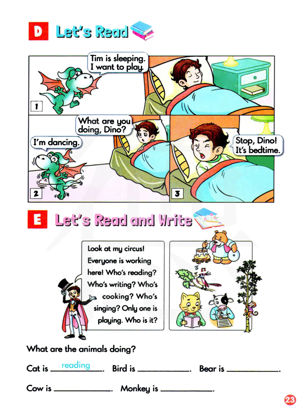 看一看我的马戏团。这里的每一位都在工作。谁在看书?谁在写字?谁在唱歌?只有一个在玩耍。它是谁?