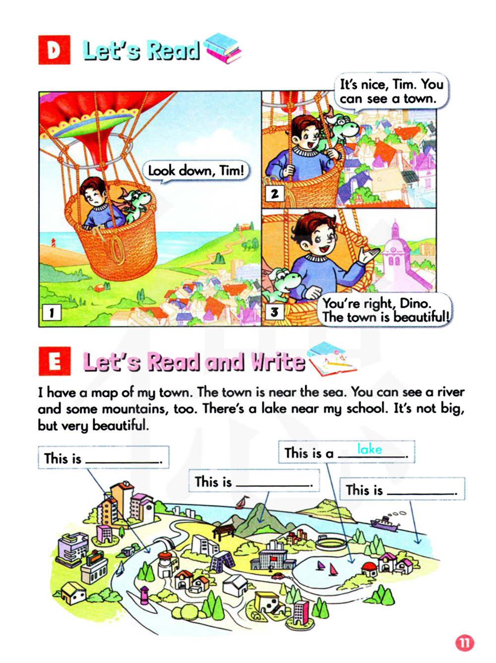 我有一张我所在城镇的地图。城镇靠近大海,你也可以看到一条河流和一些山。我的学校附近有一片湖。它不大,但是很美丽
