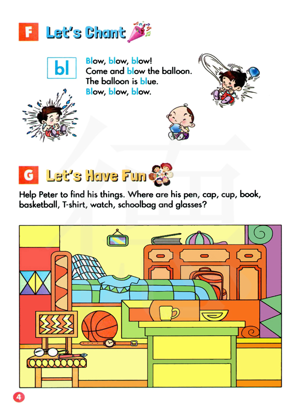 帮助彼得找到他的东西,他的钢笔,帽子,杯子,书,篮球,T桖衫,手表,书包和眼镜在哪里?