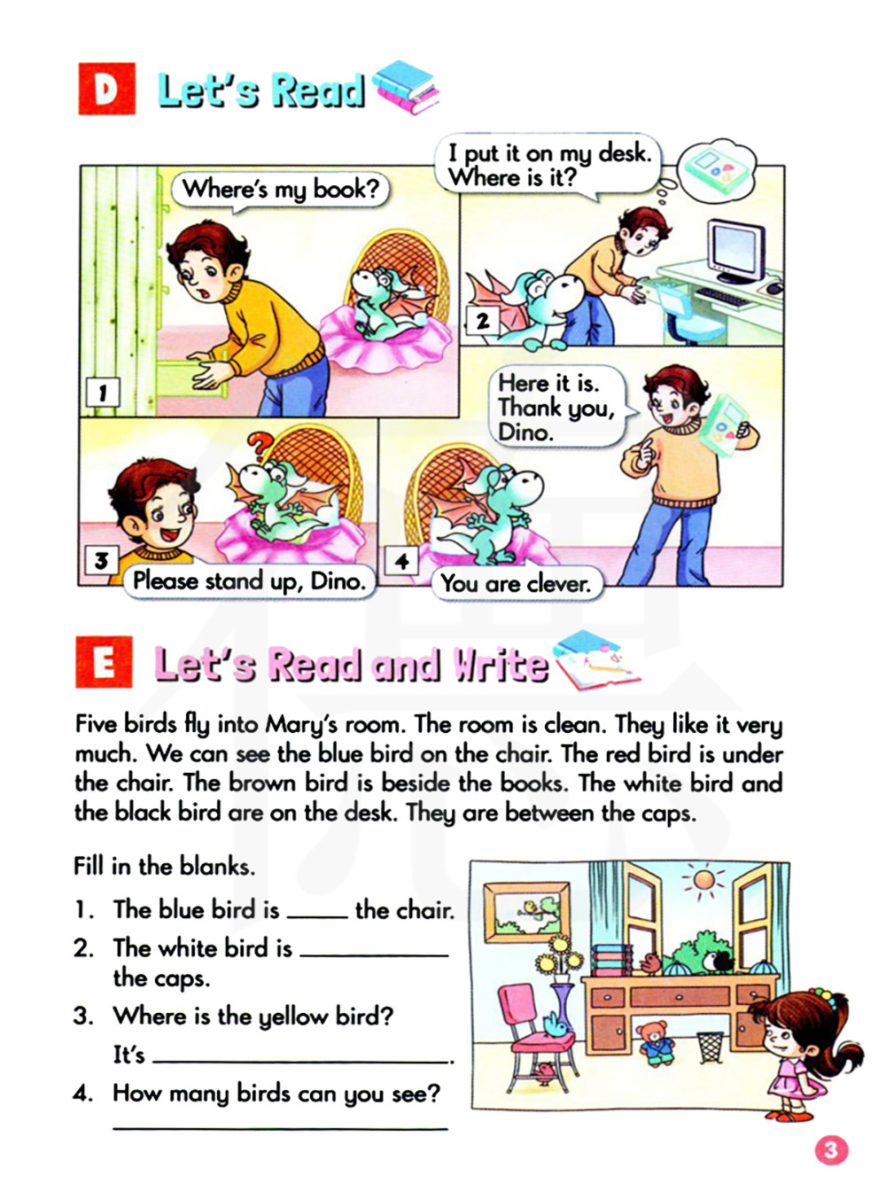 五只小鸟飞进了玛丽的房间。房间很干净。它们非常喜欢它。我们可以看到蓝色的小鸟在椅子上面。红色的小鸟在椅子下面。棕色的小鸟在书旁边。白色的小鸟和黑色的小鸟在书桌上面。它们在帽子中间。