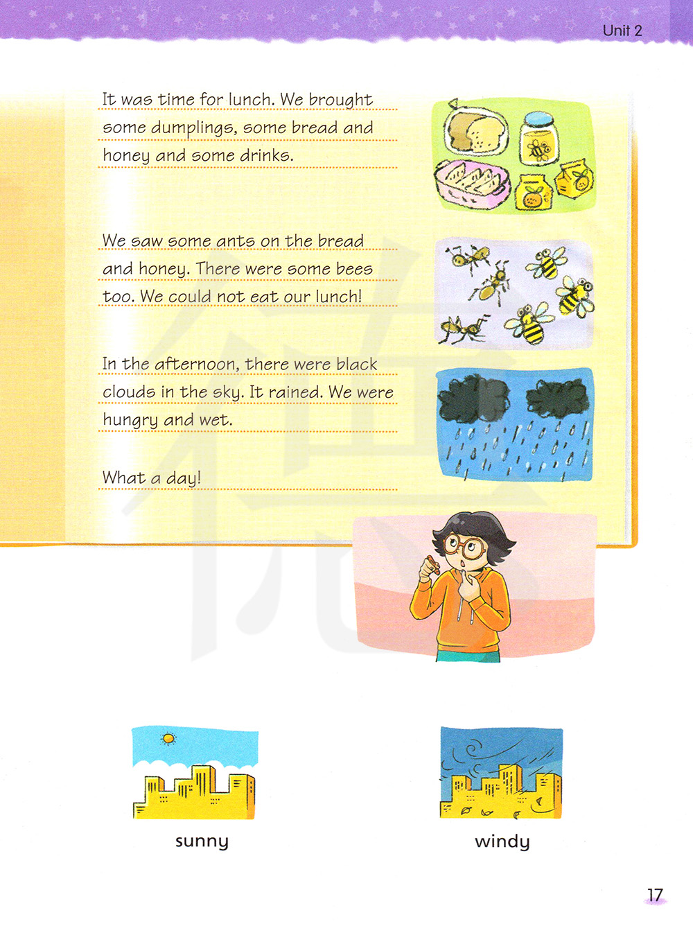 2. asunny/ windy / rainy day 晴朗的/ 刮风/下雨的一天