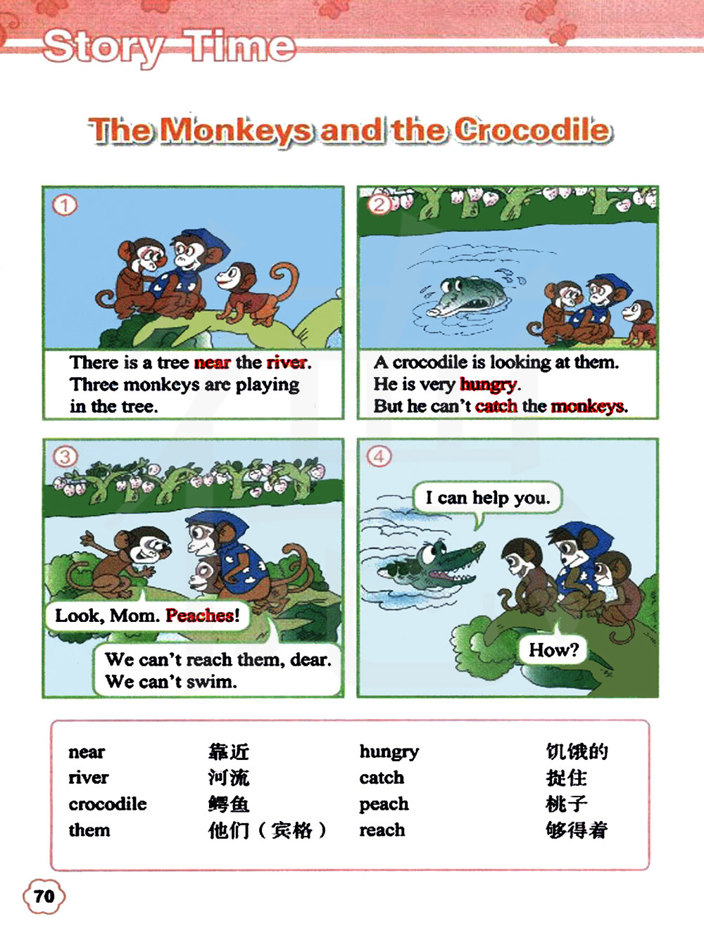 一条鳄鱼看着他们,他很饿,但是他够不着猴子们。