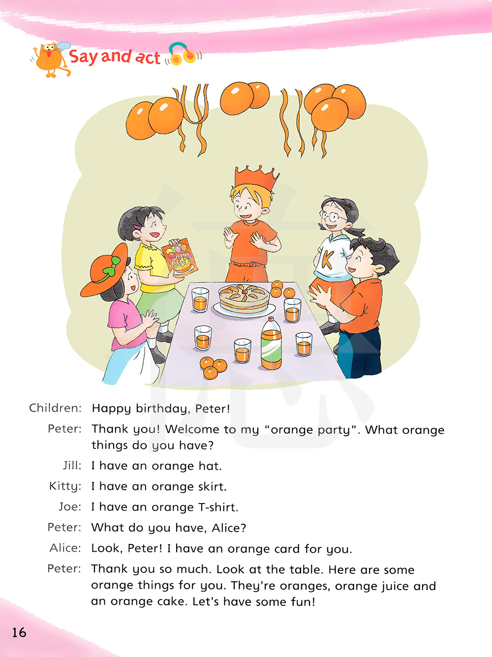非常感谢。看看桌子.这有些给你们的橙色的东西。它们是橙子,橙汁和橙子蛋糕。我们一起玩吧!