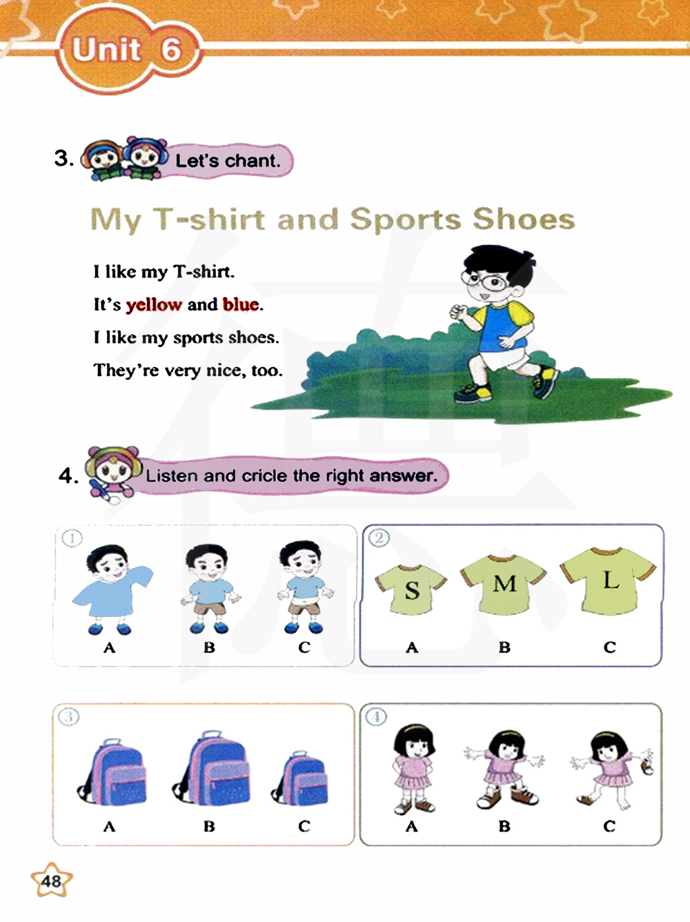 我喜欢我的T恤衫。它是黄蓝相间的。我喜欢我的运动鞋,它们都很漂亮