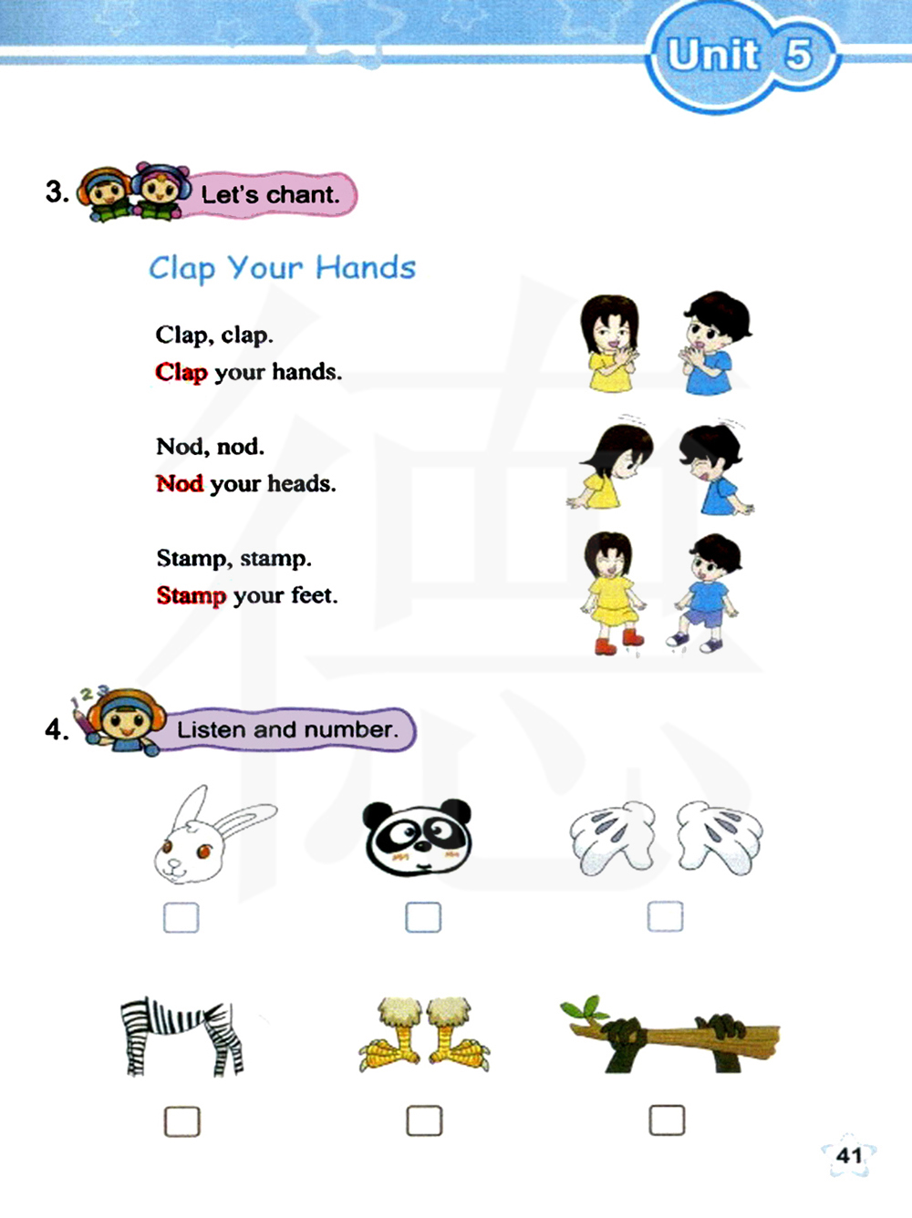 拍手,拍手。 拍拍你的手 。 点头,点头。 点点你的头。 跺脚,跺脚。 跺跺你的脚
